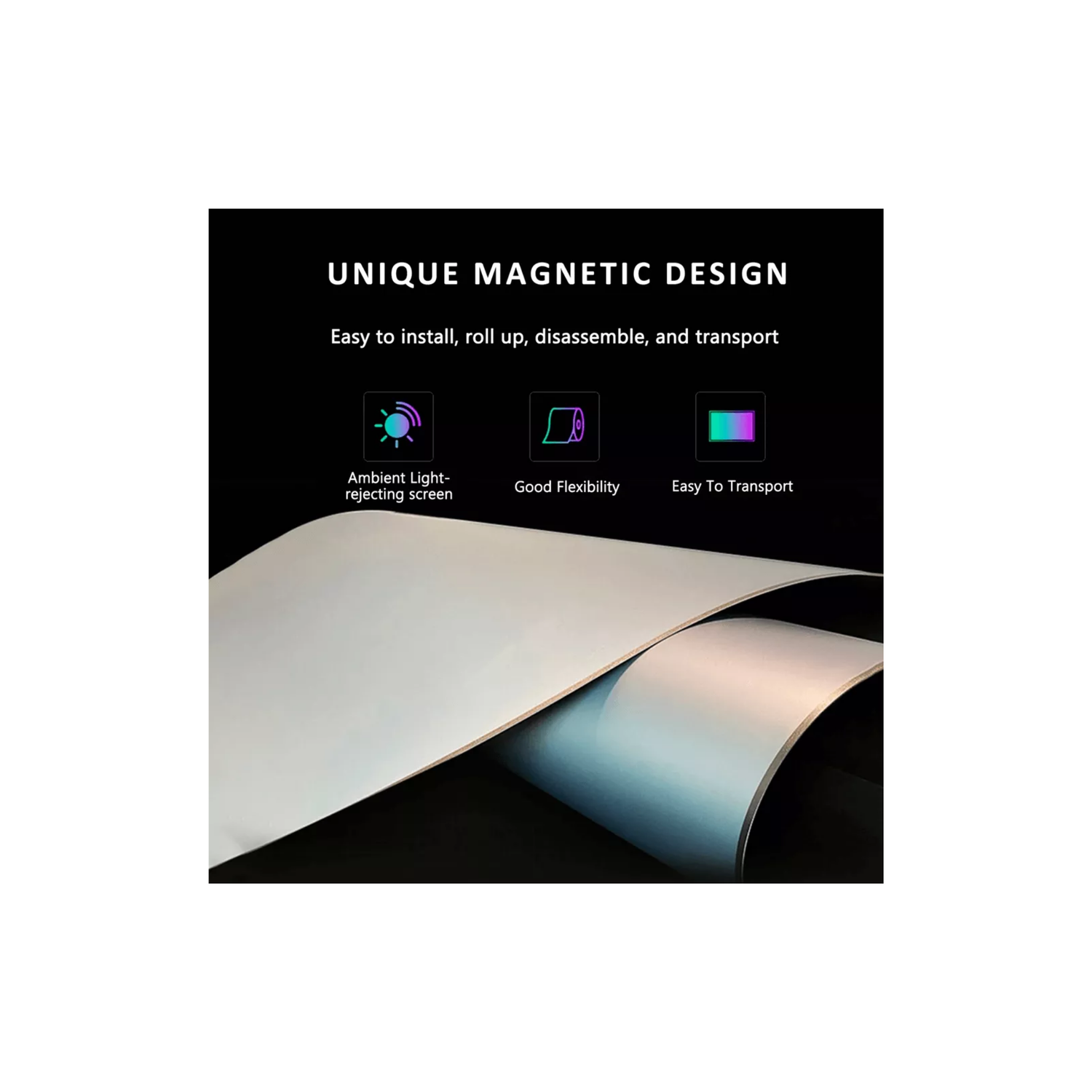 The screen’s magnetic rollable frame ensures quick setup, easy transportation, and hassle-free storage without compromising display tension.